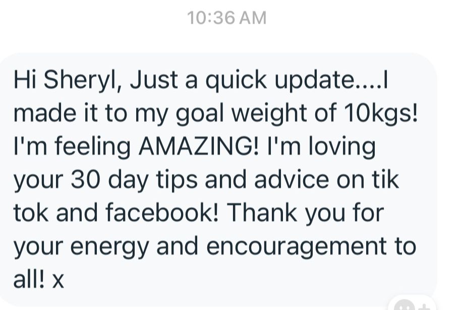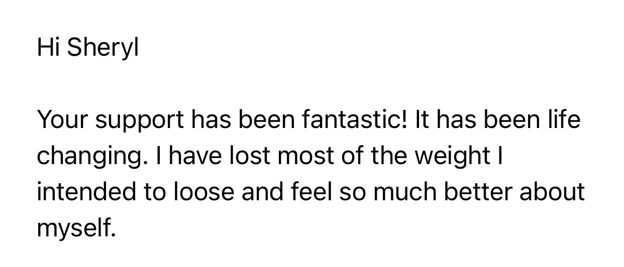 Sheryl has maintained her own 30kg weight loss for 25 yeras and she specialises in helping women over 40 balance their blood sugars, and get back in control of their eating.